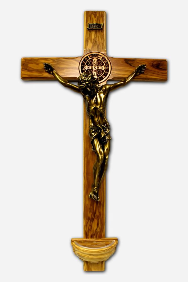 WALL MOUNTED CRUCIFIX WITH FONT AND SAINT BENEDICT MEDAL – 18 X 4 X 33 INCHES